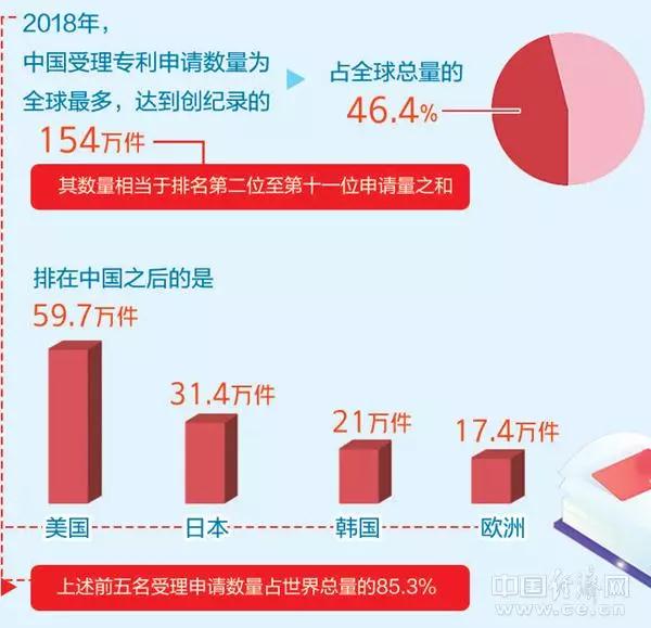 在世界知识产权组织此前举办的新闻吹风会上,“中国”成为发布方介绍情况和记者们提问中的高频词。该机构总干事高锐及首席经济学家芬克多次提到中国在世界知识产权事业中的突出地位。高锐表示,2018年,亚洲在专利、商标、工业品外观设计和其他知识产权申请量上继续超越其他地区,仅中国就占了世界专利申请量近一半,印度也取得了令人瞩目的增长,亚洲已经成为全球创新枢纽。 报告显示,中国专利申请数量继续在全球领先。2018年,中国受理专利申请数量为全球最多,达到创纪录的154万件,占全球总量的46.4%,其数量相当于排名第二位至第十一位申请量之和。排在中国之后的是美国(59.7万件)、日本(31.4万件)、韩国(21万件)和欧洲(17.4万件),上述前五名受理申请数量占世界总量的85.3%。 报告指出,亚洲是全球专利申请的枢纽,其全球专利申请最活跃地区的地位得到巩固。2018年,亚洲受理的专利申请量占世界总量的三分之二(66.8%),相比2008年的50.8%增幅显著,这主要得益于中国经济增长的推动。北美受理的专利申请量占2018年世界总量近五分之一(19%),欧洲的占比略超十分之一(10.9%),非洲、拉美和加勒比地区以及大洋洲的份额合计占全球总量的3.3%。