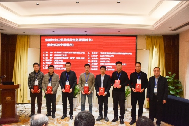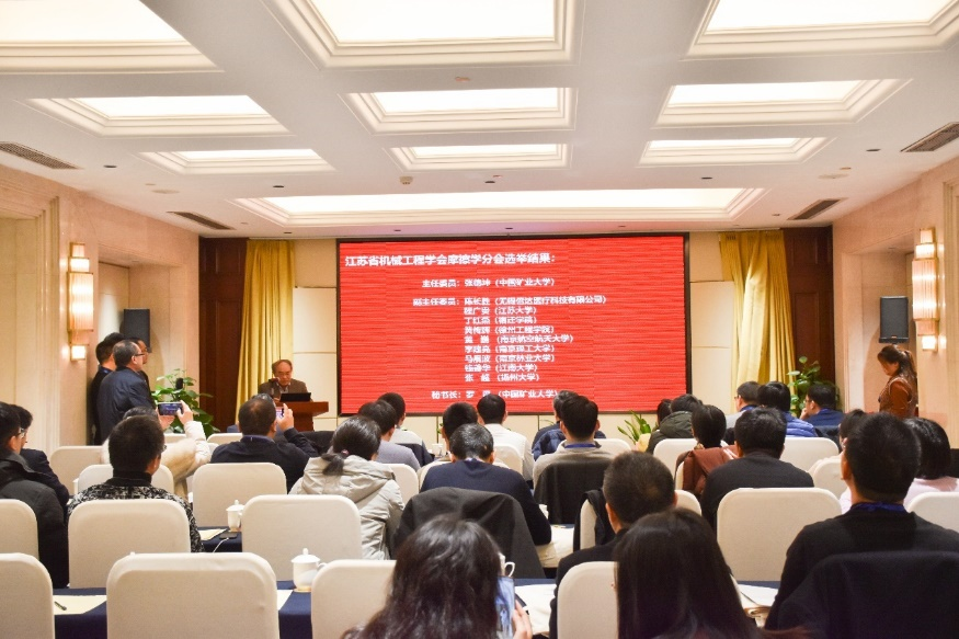 徐爱民秘书长宣读了摩擦学分会换届结果: 摩擦学分会主任委员为中国矿业大学张德坤教授,副主任委员9人,分别为无锡倍达医疗科技有限公司陈长胜总经理、江苏大学程广贵教授、宿迁学院丁红燕教授、徐州工程学院黄传辉教授、南京航空航天大学黄巍教授、南京理工大学李建亮教授、南京林业大学马晨波教授、江南大学钱善华教授、扬州大学张超教授。秘书长为中国矿业大学罗勇教授。常务委员为徐工工程机械研究院陈波等25人,委员为江南大学卞达等51人,徐爱民秘书长为主任委员、副主任委员、秘书长颁发聘书。