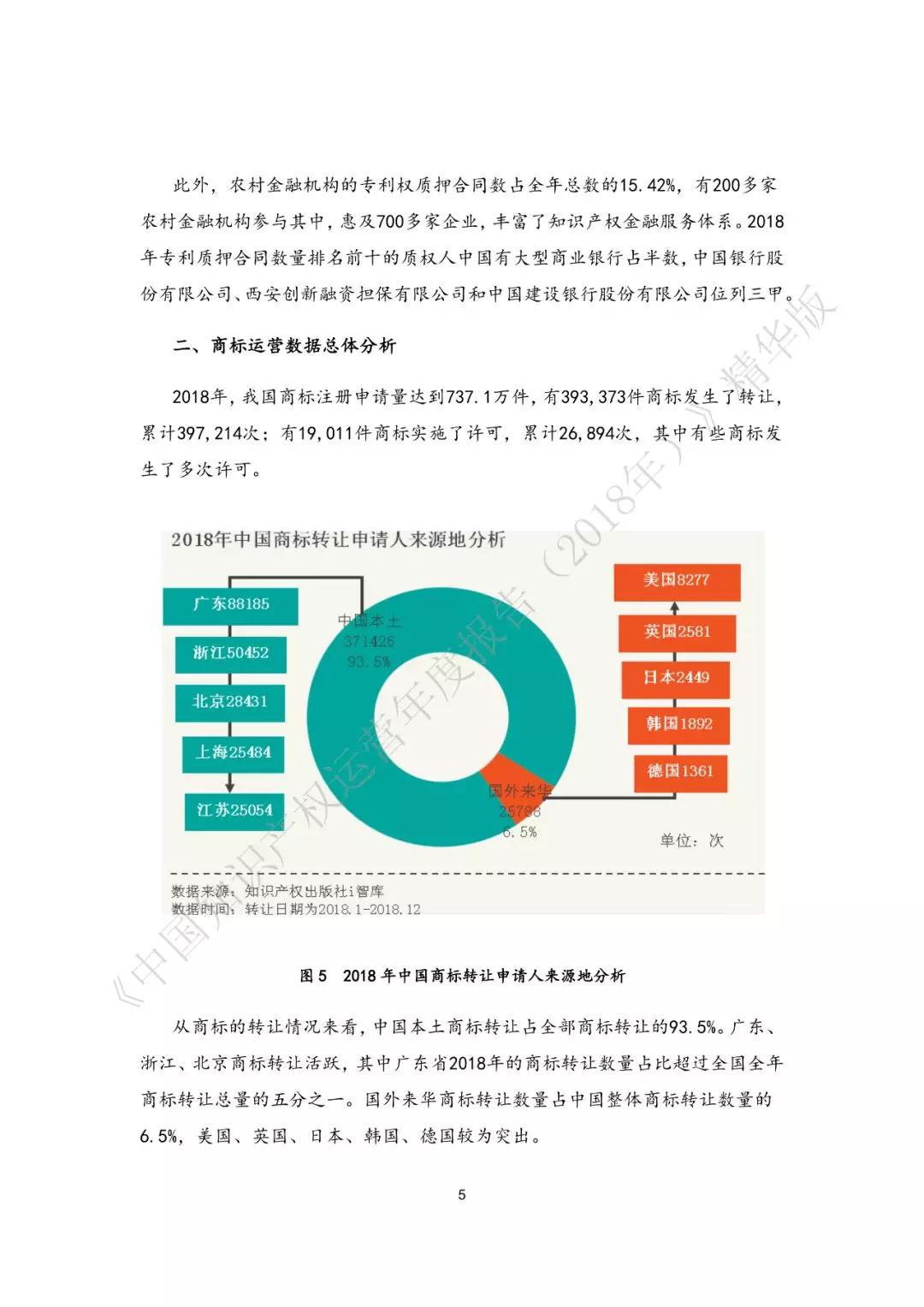 ,涉及专利件数为235,811件,较2017年同比增长3.1%;全国有效注册商标中,有393,373件商标发生了转让,累计达397,214次,有19,011件商标实施了许可,累计达26,894次。