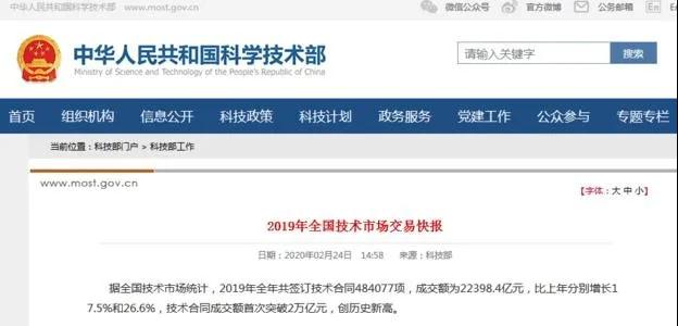 2月24日,科技部发布2019年全国技术市场交易快报。据全国技术市场统计,2019年全年共签订技术合同484077项,成交额为22398.4亿元,比上年分别增长17.5%和26.6%,技术合同成交额首次突破2万亿元,创历史新高。