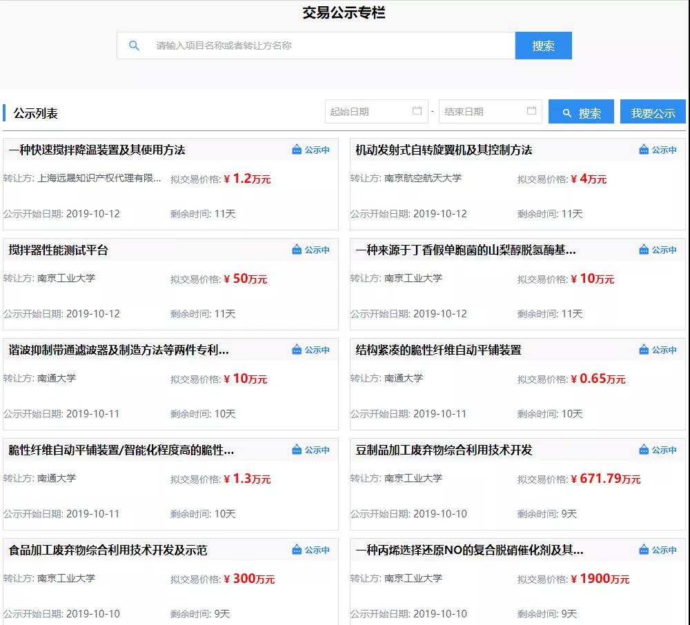如下图所示,公示的对象是通过协议定价的科技成果交易信息,主要包括转让方名称、科技成果名称及拟交易价格。公示期不少于15自然日。