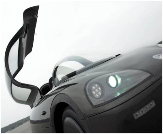 车内采用了整洁,运动的设计能为2个人提供足够的空间。塔式的玻璃车顶由聚碳酸酯制成并有防紫外线功能。座椅采用镁金属结构以减轻重量。后座乘客可以很舒适的将脚放在位于驾驶位2旁的脚凳上面。驾驶员面对的是一个平顶的方向盘,座舱的风格就好像置身于一台喷气式飞机上。中央圆形仪表的左右2边是2台显示屏提供后视图像,在前面右边控制台上的是换档开关,电子手刹开关以及启动键。左边控制加热,通风以及车内灯照明。