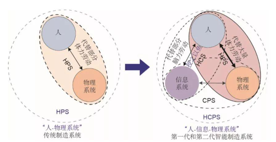 文章指出,传统制造系统包含人和物理系统两大部分,是完全通过人对机器的操作控制去完成各种工作任务,并可抽象描述“人-物理系统”(HPS)。与传统制造系统相比,第一代和第二代智能制造系统发生的本质变化是,在人和物理系统之间增加了信息系统,信息系统可以代替人类完成部分脑力劳动,人的相当部分的感知、分析、决策功能向信息系统复制迁移,进而可以通过信息系统来控制物理系统,以代替人类完成更多的体力劳动,这一转变可用 “人-信息-物理系统”(HCPS)进行描述。
