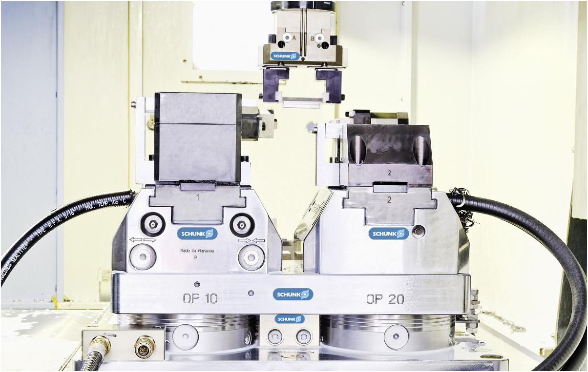SCHUNK TANDEM plus 虎钳的设计特别适用于自动化机床上料的需求。在这种精益自动化解决方案中,它们与 SCHUNK VERO-NSL plus 快换模块组合,并通过机床本身的轴完成上料。