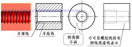 在剖视图中,小径用粗实线表示,大径用细实线表示;在投影为圆的视图上,表示大径圆用细实线只画约3/4圈,倒角圆省略不画,螺纹的终止线用粗实线表示,剖面线画到粗实线处。