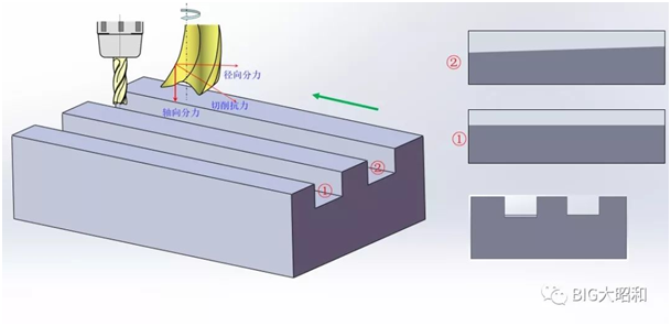 下图是同一个铣刀在不同夹持力刀柄下的槽加工。②号刀柄由于夹持力不足,从而造成掉刀现象,铣出来的槽深度呈斜坡型。