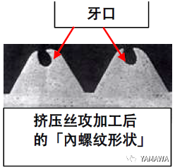 ◆下图内螺纹牙顶上,会产生U字形状缺口,称为「牙口」,使用切削丝攻则不会有此情形。