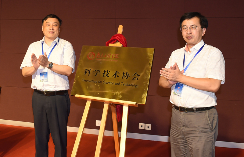 在全场热烈的掌声中,史金飞院长与冯少东副主席共同为“南京工程学院科学技术协会”揭牌。