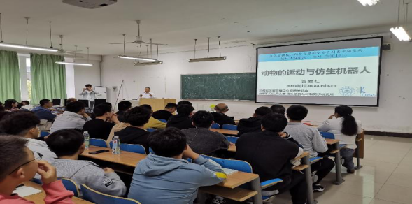 吉爱红副理事长深入浅出地讲解了国内外仿生机器人领域的研究进展,重点介绍了课题组近年来在仿生机器人领域所开展的研究工作,并现场展示了壁虎仿生机器人、仿生鱼等课题组研发样机,精彩的报告引起了与会师生的共鸣。针对师生们所关心的问题,他用幽默生动的语言予以解答。现场气氛活跃,师生交流融洽,开阔了学生的视野。