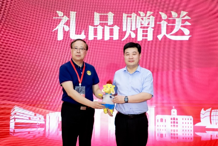 苏州大学教务处处长方亮代表大赛承办方接受“金象”吉祥物