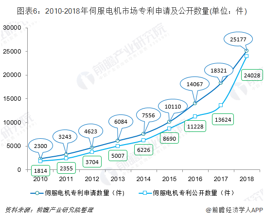 2010年以来,中国企业在伺服电机领域研发投入整体呈现上升趋势,相关专利申请及公开数量实现稳定增长。通过soopat专利网通过关键字“伺服电机”查询行业专利数量,2018年,伺服电机行业相关专利申请数量达到25177件,同比增长37.4%,专利公开数量为24028件,同比增长76.4%。