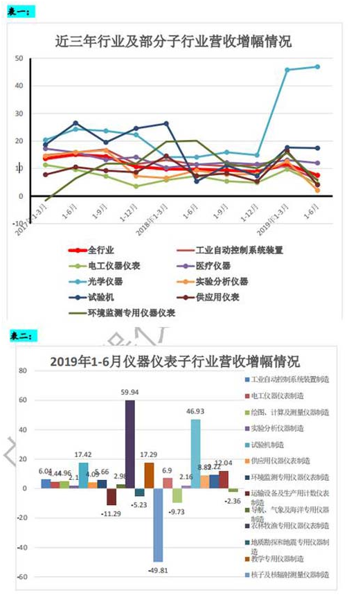 国家统计局数据显示,2019年上半年仪器仪表大行业规模以上企业4927个,营收规模4002亿元,营收同比7.57%;利润总额为361亿元,同比增长 2.87%,比主营收入低4.70个百分点;期间费用中,财务费用同比 19.53%增幅较高,利息同比23.20%;负债总计同比10.15%;管理费用同比增幅0.26%;应收账款同比增长7.73%,资产负债率为45.50%,高于去年同期1.96个百分点。根据海关统计2019年1-6月进口总额246.6亿美元,出口总额150.9亿美元。进出口逆差达95.7亿美元,比去年同期下降13%。