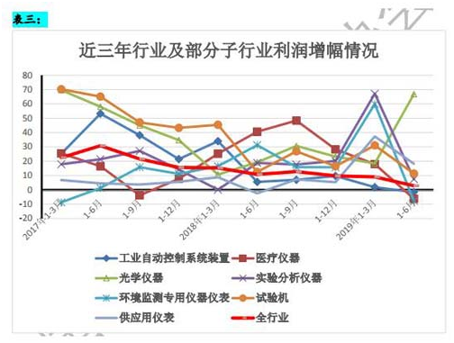 2、利润。利润总额增幅低于营收增幅4.7个百分点,其中:光学仪器利润增幅高于营收增幅20多个百分点,衡器、地质仪器、供应用仪表的利润增幅亦远高于营收增幅,实验分析利润增幅基本稳定;而医疗仪器、汽车仪表、环境监测等几个分行业利润增幅远低于营收增幅,自动化仪表行业的利润增幅仅为-1.58%;行业增产不增收或增收不增利的情况加剧,盈利能力提升压力很大。